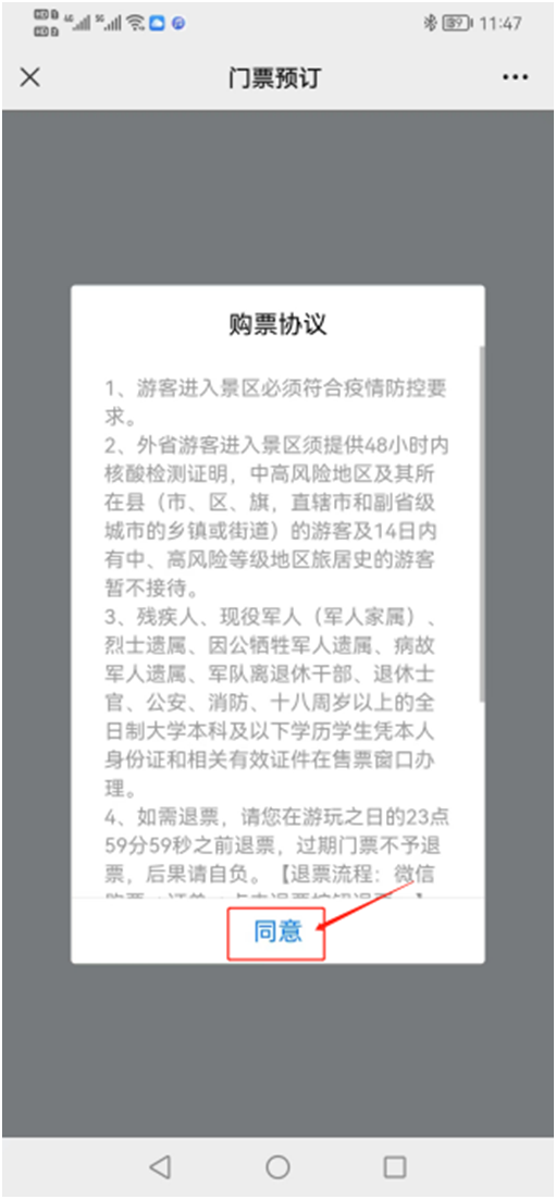 3、閱讀“購票(piào)協議”,點擊“同意”,進入預約界面。